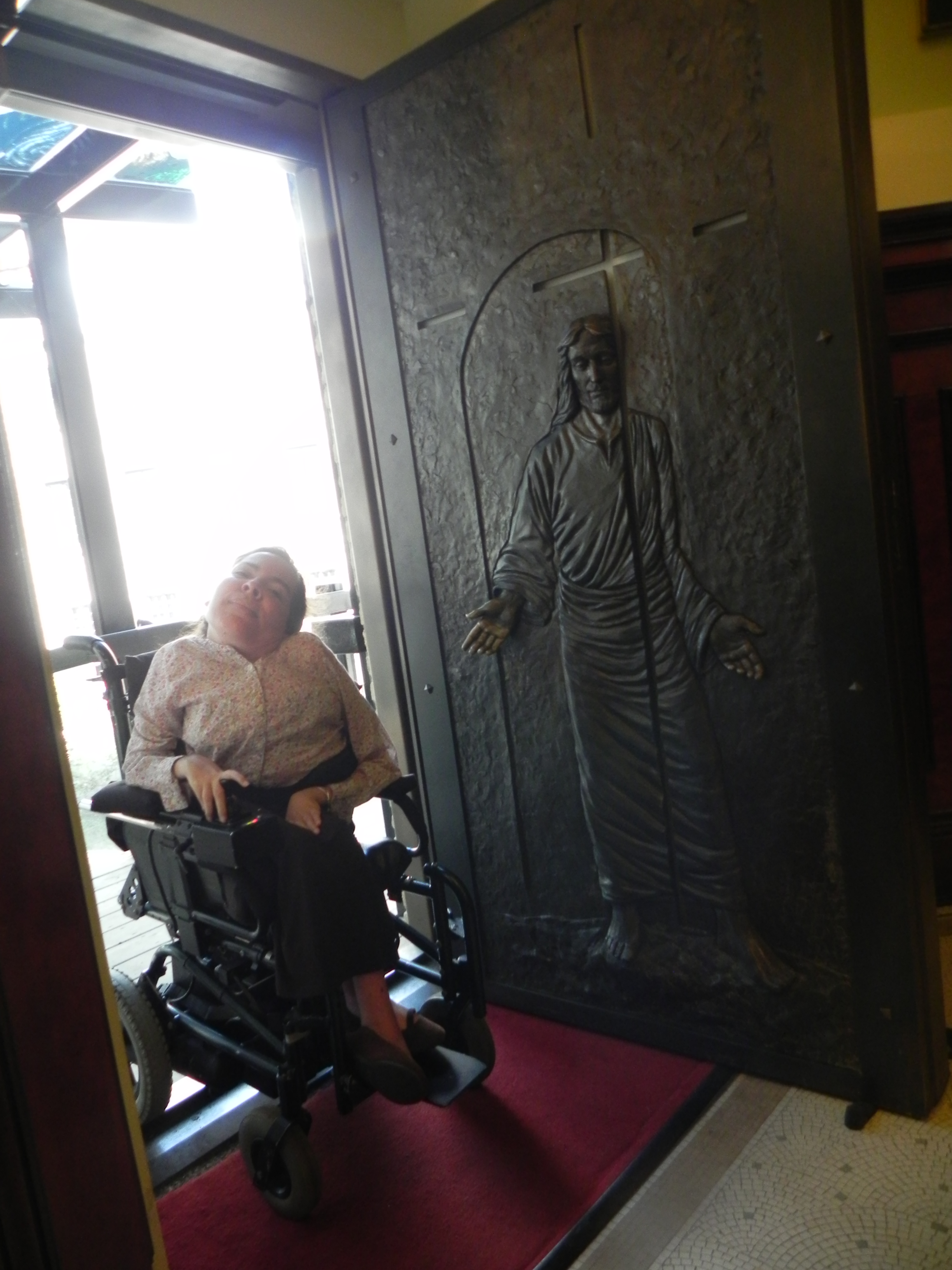 “Blessed are those who have not seen and still believe…Persevere in prayer… Love your enemies… Blessed are the peacemakers…”. And, yes, I did think about René(e) with a special kind of love. I had a hard time maneuvering my wheelchair on the path and kept coming off of it and needing help to get back on it. I said to my father, “This is emblematic of my spiritual journey — I keep straying off of the path.” Later, I thought of this truly in terms of pilgrimage, the pilgrimage of our lives here on earth, the pilgrim Church… we live and pray and climb on our way on earth up to the Holy Door of Paradise — may we all enter through.