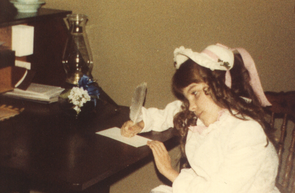 Featured Image: Me, at eight years old, dressed up as an old-fashioned girl and pretending to write with a “quill”